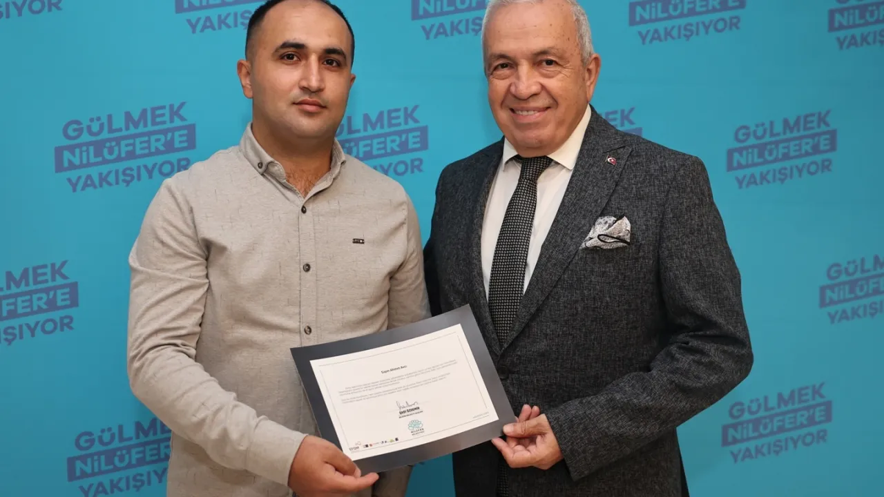 Bursa'da Nilüfer Belediye Başkanı Şadi Özdemir, 10 Ağustos 2025’te Balıkesir’in Sındırgı ilçesi merkezli yaşanan 6,1 büyüklüğündeki deprem sırasında örnek bir davranış sergileyen güvenlik görevlisi Ahmet Avcı’yı makamında ağırladı.BURSA (İGFA) - Nazım Hikmet Kültürevi’nde görevli olan Ahmet Avcı, deprem anında vatandaşların paniğe kapılmadan, güvenli şekilde tahliye edilmesine öncülük etmişti. Bu soğukkanlı ve cesur tavrı nedeniyle Başkan Şadi Özdemir tarafından tebrik edilen Avcı’ya, Nilüfer Belediyesi yöneticileri de teşekkürlerini iletti.