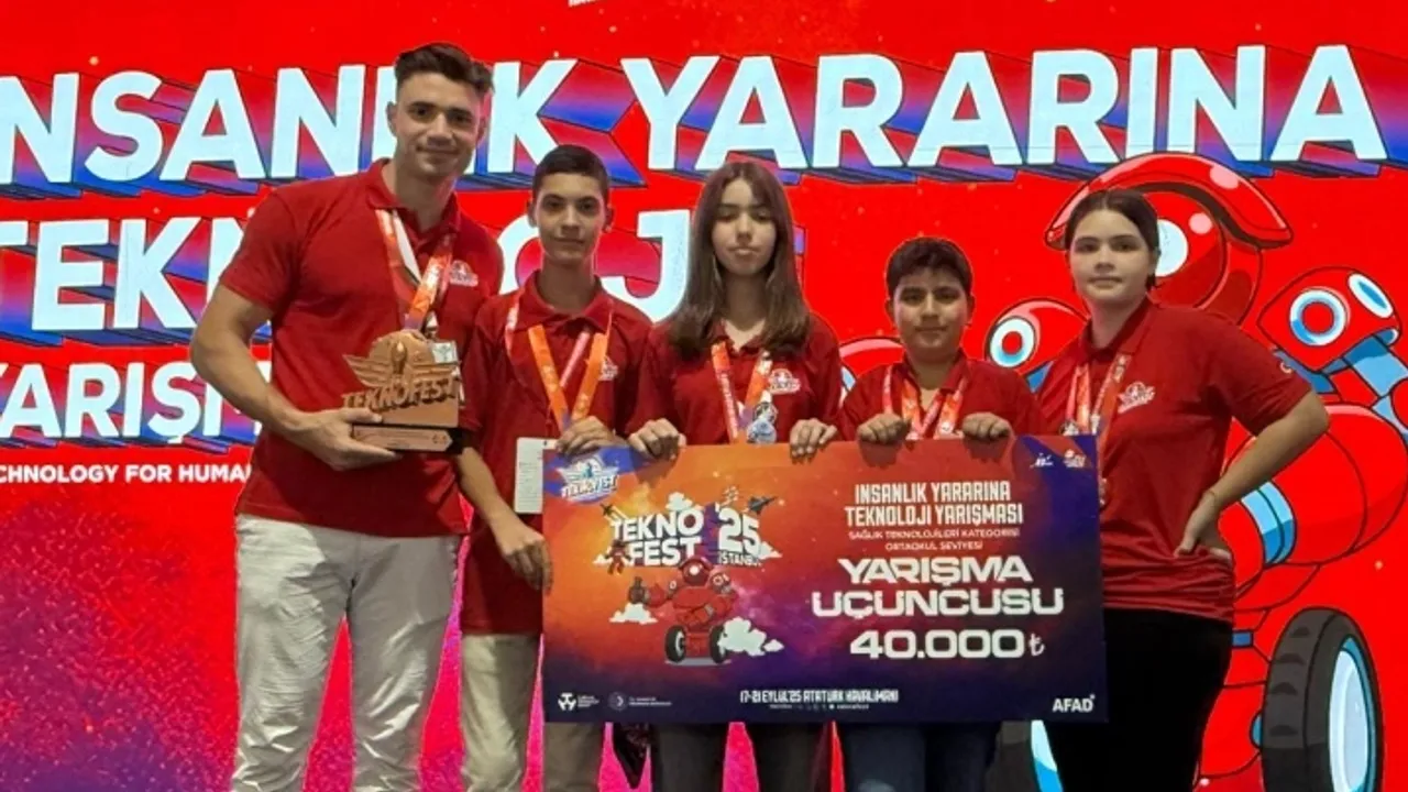 Danışman öğretmen Muhammet Emin Uçar rehberliğinde yürütülen projede; öğrenciler Sare Erkonak, Metehan Ata Doğan, Duru Naz Hazır ve Mert Yıldız, ortaokul seviyesinde Türkiye üçüncüsü oldu.